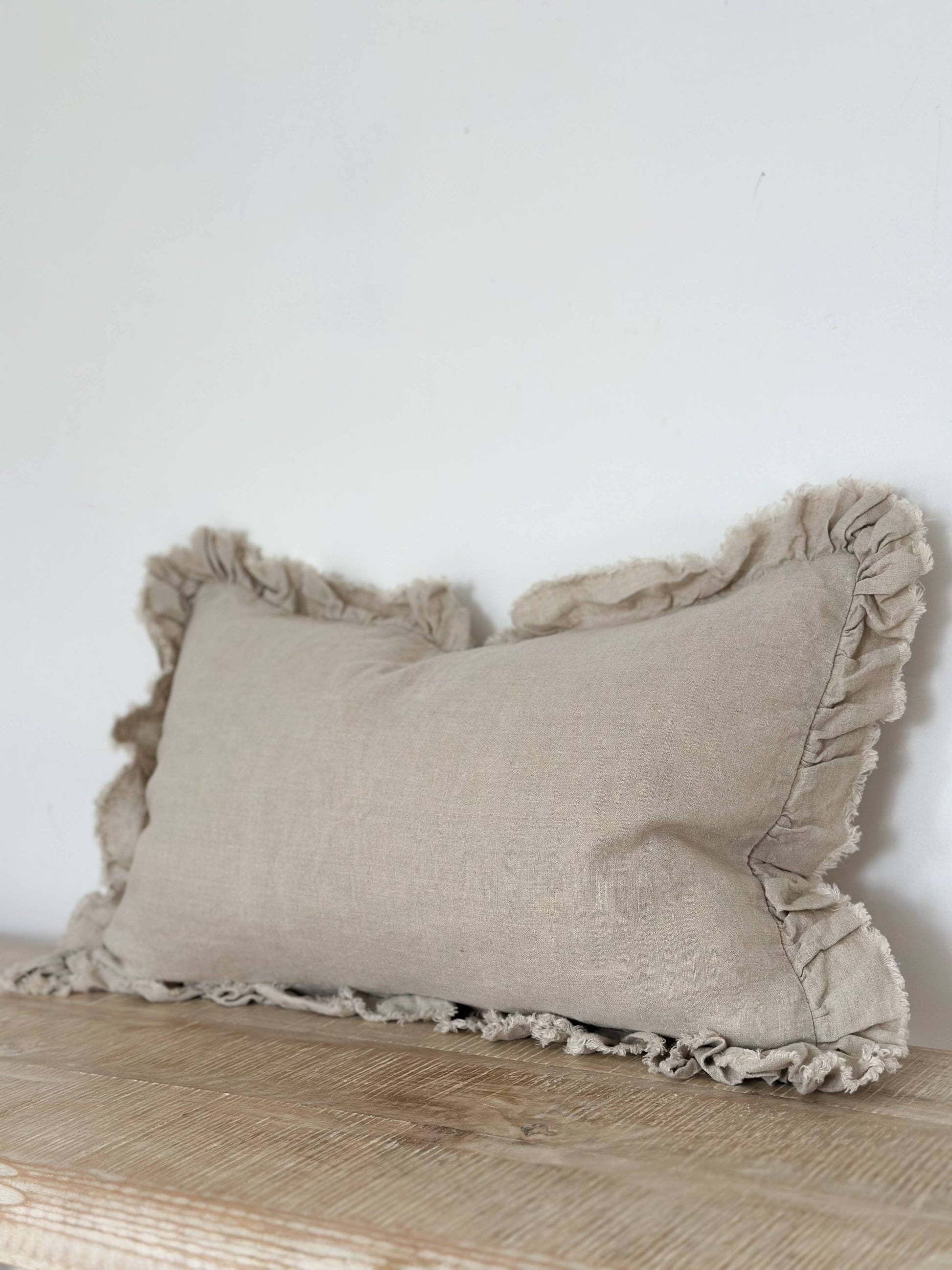 A soft natural linen cushion in a 50x30cm format, finished with a relaxed ruffle edge.